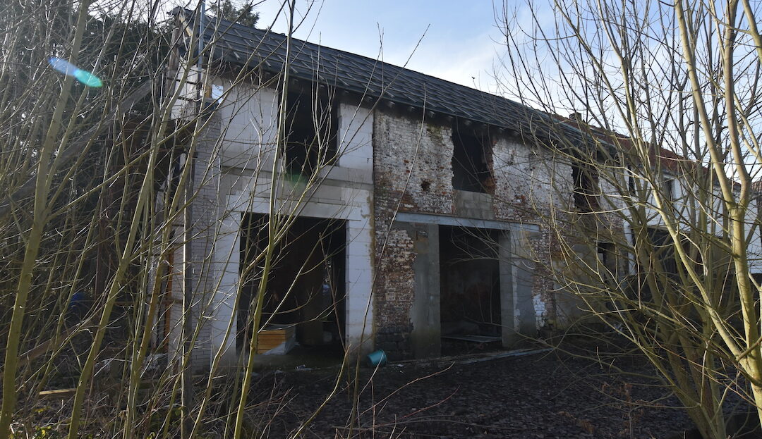 Bâtiment à rénover et à transformer en maison d’habitation unifamiliale avec jardin – 3 façades – 1 volume – 2 niveaux possibles (rez-de-chaussée et étage) – bâtiment implanté en retrait de la rue.